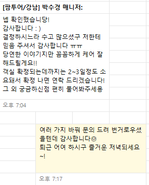 È®½ÇÇÏ°Ô °áÁ¤µÈ °ÍÀÌ ¾ø°í °øºÎÇÏ´Â °úÁ¤¿¡¼ ¼÷¼Ò °è¾àÀ» ÇÏ·Á°í ÇÏ´Ùº¸´Ï Á¦°¡ ¿©·¯ ¹ø °ßÀû ¹®Àǵ帮±âµµ ÇØ¼ ¹ø°Å·Î¿ì½Ç ¼ö ÀÖÀ»ÅÙµ¥ ¤Ð Ç×»ó Ä£ÀýÇÏ°Ô ÀÀ´ëÇØÁּ̾î¿ä!! Á¦°¡ ÆÊÅõ¾î °è¾àÇÏ°Ô µÈ °¡Àå Å« ÀÌÀ¯°¡ ¸Å´ÏÀú´ÔÀÇ Ä£ÀýÇÔ ¶§¹®ÀÌ¿¡¿ä~
