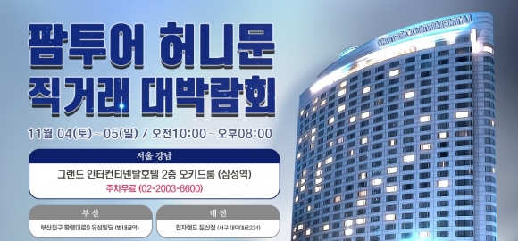 - ¹Ú¶÷ȸ ¹æ¹® Àü¿ø »çÀºÇ° 9Á¾ ¼¼Æ® ÁõÁ¤ ¹× ÆÊ ·Î¶Ç(Palm LOTTO) À̺¥Æ® ÁøÇà Çã´Ï¹®¿©Çà»ç ÆÊÅõ¾î´Â ¿À´Â 11¿ù4Àϰú 5ÀÏ ¾çÀϰ£ »ï¼º¿ª ÄÚ¿¢½º¿¡ À§Ä¡ÇÑ ±×·£µå ÀÎÅÍÄÁƼ³ÙŻȣÅÚ¿¡¼ ÃÊ´ëÇü Çã´Ï¹®¹Ú¶÷ȸ¸¦ °³ÃÖÇϴµ¥ ´Ù¾çÇÑ ÇýÅðú ƯÀüÀ» ¸¶·ÃÇß´Ù°í ¹àÇû´Ù. ÆÊÅõ¾î »ï¼º¿ª ÄÚ¿¢½º ±×·£µå ÀÎÅÍÄÁƼ³ÙÅ» Çã´Ï¹® ´ë ¹Ú¶÷ȸ´Â ·°¼Å¸®ÇÏ°í ¿ì¾ÆÇÑ ºÐÀ§±âÀÇ È£ÅÚ¿¡¼ Æí¾ÈÇÏ°Ô ½ÅÈ¥¿©Çà »ó´ãÀ» ¹ÞÀ» ¼ö ÀÖµµ·Ï ÁøÇàÇÒ ¿¹Á¤À̶ó °áÈ¥À» ¾ÕµÐ ¿¹ºñ ½ÅÈ¥ºÎºÎµéÀÇ ¹æ¹®Çà·ÄÀÌ À̾îÁú °ÍÀ¸·Î ±â´ë°¡ µÇ°í ÀÖ´Ù. ÆÊÅõ¾î »ï¼º¿ª ÄÚ¿¢½º ±×·£µå ÀÎÅÍÄÁƼ³Ù