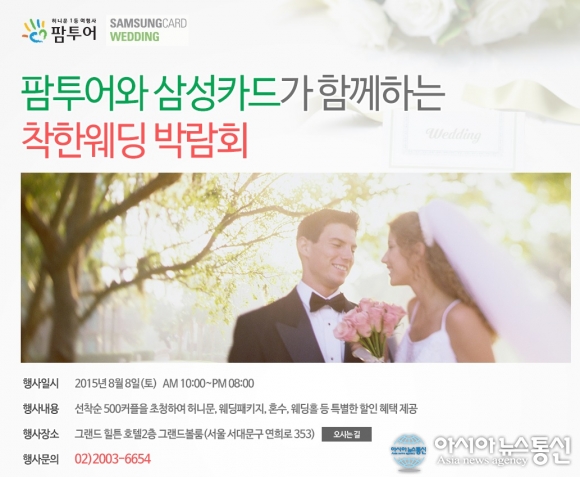 ÂøÇÑ¿þµù ¹Ú¶÷ȸ.(»çÁøÁ¦°ø=ÆÊÅõ¾î) ´ëÇѹα¹ 1µî Çã´Ï¹® Àü¹®¿©Çà»ç ÆÊÅõ¾î(´ëÇ¥ÀÌ»ç ±ÇÀÏÈ£)´Â ¿À´Â 8ÀÏ(Åä)ºÎÅÍ 9ÀÏ(ÀÏ)±îÁö ¾çÀϰ£ ¼¿ï ±×·£µå ÈúưȣÅÚ 2Ãþ ±×·£µåº¼·ë(¼¿ï ¼´ë¹®±¸ ¿¬Èñ·Î 353)¿¡¼ »ï¼ºÄ«µå ȸ¿ø ¹× ÀÓÁ÷¿ø ¿¹ºñ ½ÅÈ¥ºÎºÎµéÀ» ´ë»óÀ¸·Î ÂøÇÑ¿þµù ¹Ú¶÷ȸ¸¦ °³ÃÖÇÑ´Ù. ù³¯¿¡´Â »ï¼ºÄ«µå ȸ¿ø ¿¹ºñ ½ÅÈ¥ºÎºÎ ¼±Âø¼ø 500¿© Ä¿ÇÃÀ» ÃÊÃ»ÇØ Çã´Ï¹®, ¿þµùÆÐŰÁö, È¥¼ö, ¿þµùȦ µî Ưº°ÇÑ ÇýÅÃÀÌ Á¦°øµÊÀº ¹°·Ð ¹æ¹®À» ÇÒ °æ¿ì ¼ýÀÚ º¸Æ²(Ä¿Çà ´ç 2°³), »ï¼ºÀüÀÚ ÆÄÄ«±Û¶ó½º 21Á¾ ¼¼Æ®, ¸¶³ëµð¼ÎÇÁ ½º